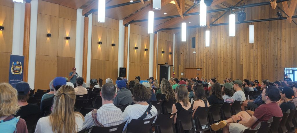 Au briefing, je revois mes amis, au moins tout autant excité que moi, eux qui vont tous courir une telle distance pour la première fois. Je me rends vite compte que nous sommes bien plus nombreux que l’année précédente (j’apprendrais plus tard que nous sommes effectivement plus du double). À 16H, différents intervenants nous font un discours avec d’abord l’organisateur de la course John Carson, puis Sergio Avila, représentant les premières nations. Un moment de recueillement est présidé par Karole O’Brien, nous rappelant que nous traverserons un territoire sacré des premières nations. Enfin, Elias Park, qui s’occupe de l’aspect sécurité, nous informe des différents risques encourus et en particulier la conduite à tenir en cas de rencontre avec un ours!! Le dossard (n°3 pour moi) enfin en main, il est temps de rentrer pour préparer, organiser et peaufiner les affaires du lendemain. Mais avant ça, je retrouve Guillaume et Anne-Gaëlle, le couple de français rencontré le week-end d’avant durant Tackle the Toad. Je leur propose d’aller dans le bar dans lequel j’ai travaillé l’été précédent, ce qui me permet de revoir également mes anciens collègues. Nous discutons un peu et il décident de faire une randonnée le lendemain aux alentours de la course, ce qui me permettra de les voir sur le parcours. De supers supporters. Enfin de retour à la maison, Didier n’est pas là et je me prépare un bon dîner à base de pâtes fraîches, courgettes, carottes, oignons accompagnés d’une salade. Le top. H-8, il est temps de dormir, ou du moins d’essayer avec le soleil qui se couche à 23H30 ici à cette période de l’année!!