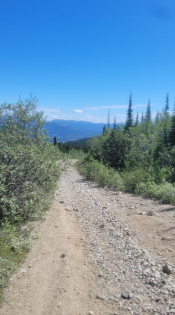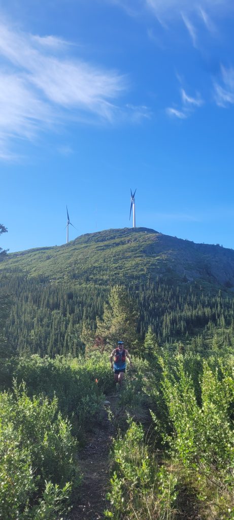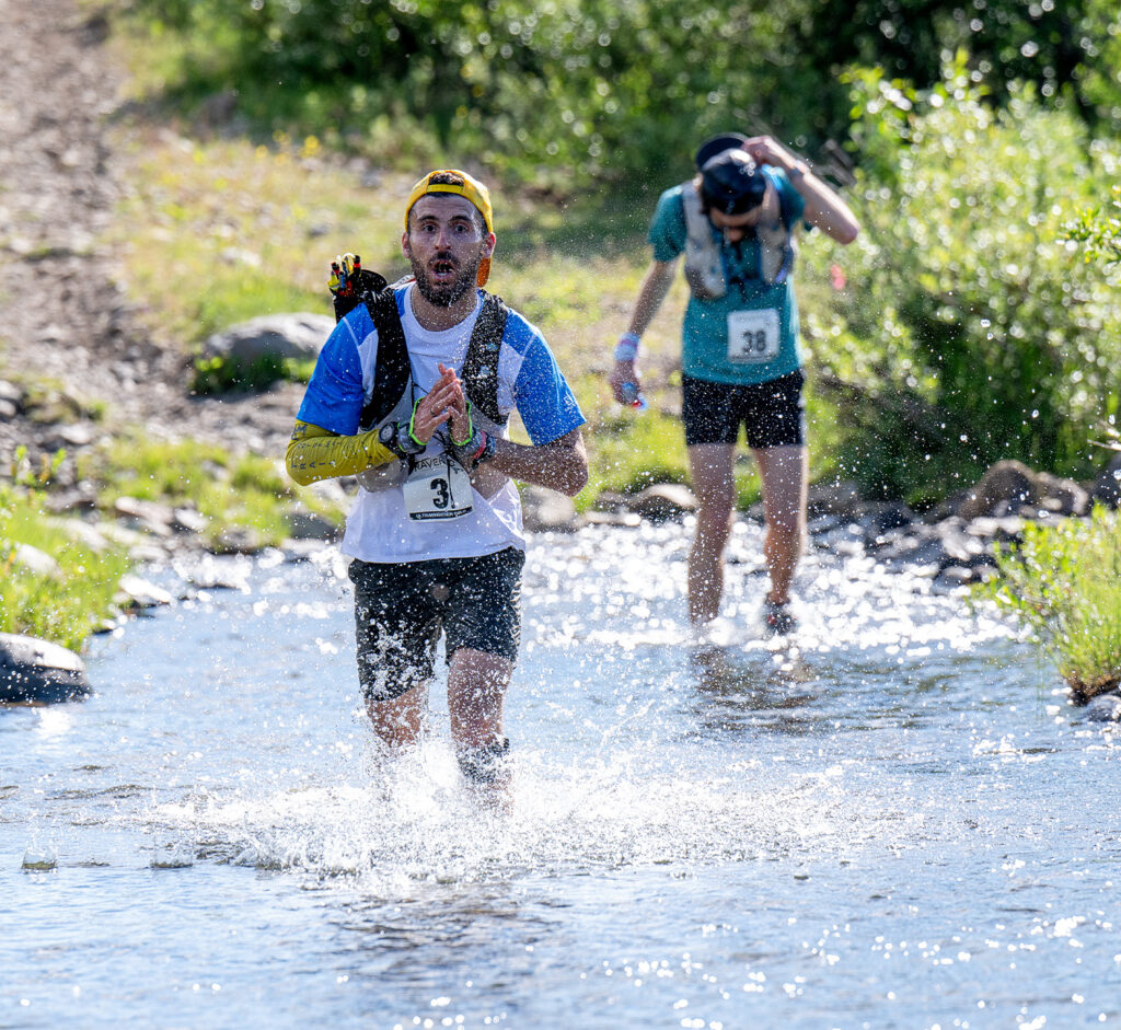 Mise à part le 3ème ravitaillement au 28ème kilomètre (d’ailleurs acheminé et mis en place à cheval), cette partie est très sauvage, l’impression d’être complètement seul. Après avoir monté ces 600D+, il faut maintenant les redescendre. On termine enfin cette section en hors sentier pour retrouver un petit single bordé d’arbustes à hauteur d’homme. Je vous cache pas que dans ce genre de situation, je suis hyper vigilant et je ralenti même dans les virages où je n’ai pas de visibilité à plus de 2 mètres devant moi en raison des ours, présent en nombre dans la région. À la moitié de la descente, on récupère ensuite une piste plus large, permettant de mettre un peu plus de vitesse. Je me fais cependant reprendre et même doubler à 3km du 4ème ravitaillement, marquant aussi la mi-course et le passage de relais pour ceux qui courent en équipe. Après une traversée de rivière à guet, très appréciable et appréciée, j’arrive alors à ce ravitaillement avec une petite minute de retard sur le 2ème.
